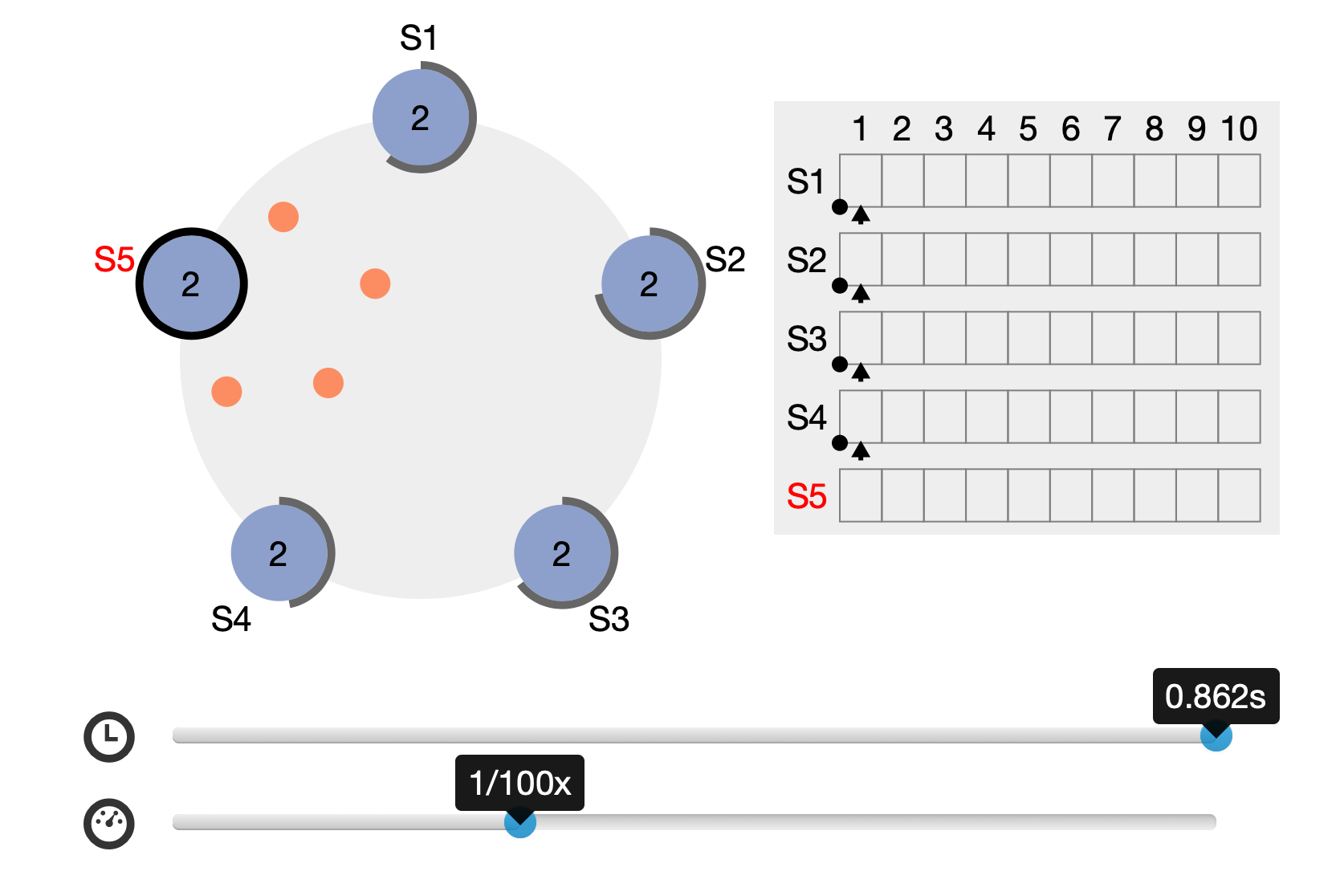 브라우저에서 실행중인 Raft 클러스터는 다음과 같습니다. Raft가 작동하는 것을 보기 위해 상호 작용할 수 있습니다. 왼쪽에는 5 개의 서버가 표시되고 오른쪽에는 로그가 표시됩니다.